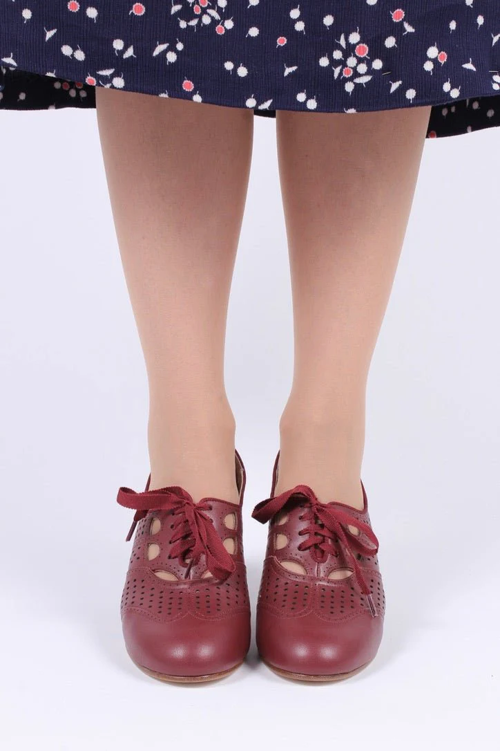 This everyday Oxford high heel combines vintage elegance with modern comfort. Featuring an ultra-feminine, medium-height Spanish heel, it exudes the charm of the early 1930s. The iconic cut-out and perforation pattern adds a distinct 30s touch, while wide grosgrain ribbon laces and edges complete the look with timeless sophistication.